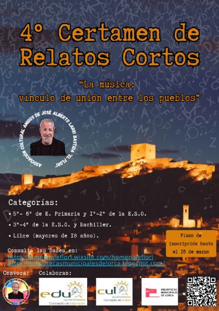 Medina ha recordado que “estos premios se entregarán el sábado, 10 de mayo, en el transcurso de la jornada de convivencia que tendrá lugar en el Parque de Las Señoritas, en el barrio de La Viña, organizada por el colectivo en homenaje al maestro y cantante lorquino, José Alberto Lario Bastida ‘El Flori’, y que, además de este certamen literario, incluye un espacio musical con la participación de siete bandas, por lo que desde aquí invito a todos a sumarse a este día en el que la música, la literatura y la convivencia en comunidad serán los protagonistas”.