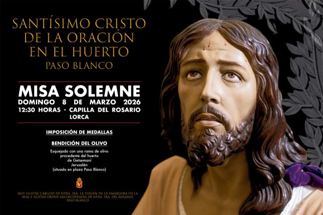 El próximo domingo 8 de marzo, a las 12:30 horas, la Capilla del Rosario acogerá la solemne eucaristía en honor al Santísimo Cristo de la Oración en el Huerto. Tras la ceremonia, se procederá al emotivo acto de imposición de crucetas a los nuevos mayordomos y a la imposición de la nueva medalla a la Comisión de la Oración en el Huerto.