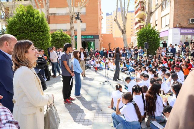 La concejal de Educación en el Ayuntamiento, Rosa María Medina, junto al director general de Atención a la Diversidad, Pedro Mondéjar, asisten al primer encuentro, que ha reunido cerca de 900 alumnos lorquinos en la Alameda de la Constitución