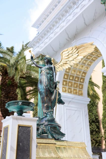 En las esquinas de la cornisa se alzan cuatro esculturas en bronce de divinidades femeninas: Minerva, Juno, Deméter y Concordia – que evocan la tradición clásica.